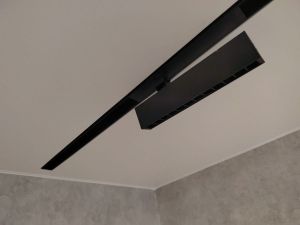 Следующий вид трекового освещения - магнитные трековые светильники для натяжного потолка. Такие системы встроены в потолок с утопленным эффектом или вровень с потолком для линейных светильников длиной от 30см до 90см.