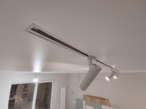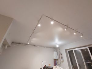 Другой способ - трек встроенный в натяжной потолок. То-есть трек будет заподлицо с потолком. После монтажа трека в натяжной потолок на него можно установить необходимое количество светильников, соответствующее максимальной допустимой мощности проводки.