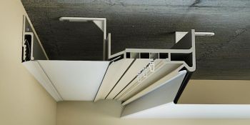 1. Ниша без перегиба материала- создаётся с применением стенового или потолочного алюминиевого профиля, который крепится к деревянной рейке 45*20 или брусу 40*40(достаточно). При этом остаётся видимой тыльная сторона ниши. Вместо деревянного бруса и профиля можно использовать алюминиевый брус БП-40. Результат будет тот же с одной лишь разничей, что тыльная сторона (обращённая к шторам) будет иметь вид алюминия. При необходимости можно окрасить видимую часть, что мы неоднократно выполняли на наших объектах.Так же нужно иметь в виду, что между брусом и перекрытием может остаться некоторый зазор. Его наличие и величина будет зависеть от величины неровности (горизонта) существующего потолка.