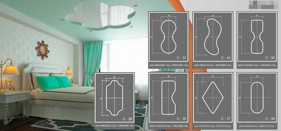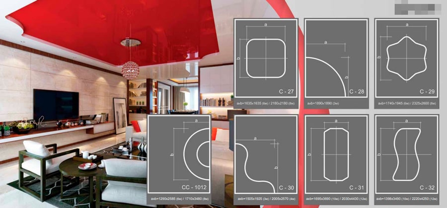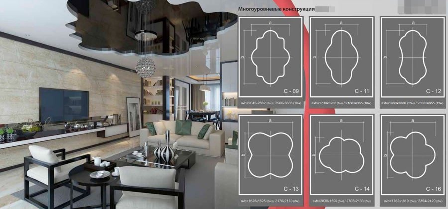 Конструкции креплений таких потолков выполняются из алюминия. Полотно потолка может быть абсолютно любым. сатин, матовый или глянец... Очень интересно смотрится сочетание различных фактур и цветов. Варианты форм двухуровневых потолков вы можете посмотреть в нашем каталоге, а их размеры мы без труда подгоним под габариты вашего помещения. Если же вы не нашли для себя ничего подходящего, мы готовы выполнить работу по вашему проекту или придумать кннструкцию на месте с вами.