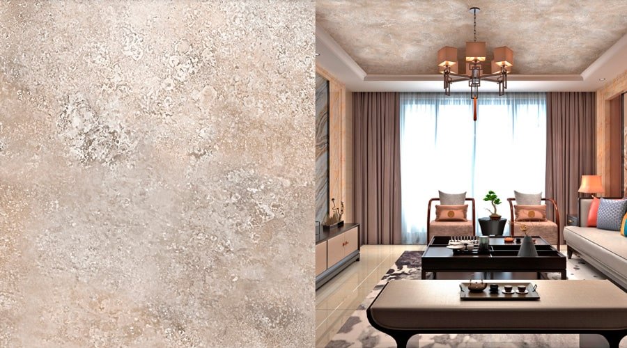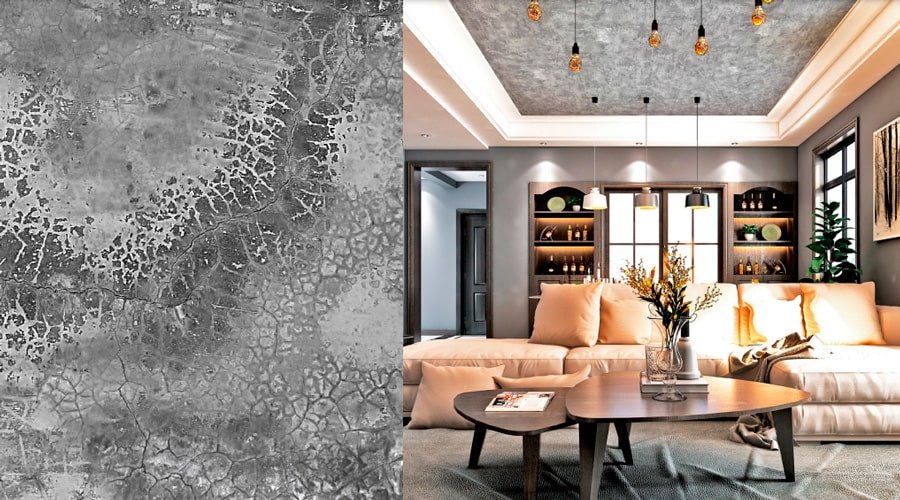 Фактурный натяжной потолок помогает создать особый эффект, придавая помещению неповторимый уют и шарм.