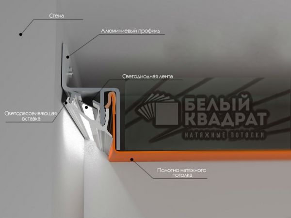 Вариант 2 - Используя профиль FLEXY FLY02 с рассеивателем, Fly01(см.фото) без рассеивателя, или ПК6 -профиль без вставки белый. Ширина зазора составит 2-2,5 см. Лента подсветки склеится в специальный раз и после монтажа не видна, светит непосредственно на стену. При взгляде вдоль стены остаётся виден белый профиль(при использовании профиля ПК6). В случае необходимости замены светодиодной ленты никаких специальных операций проводить не нужно. Вы самостоятельно сможете поменять подсветку. Видео по установке парящего натяжного потолка можно посмотреть на нашем канале в YouTube: https://youtu.be/KJ9l_GVE3Fw