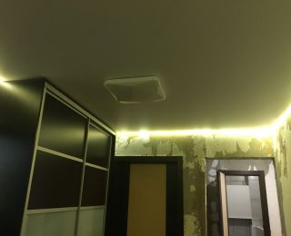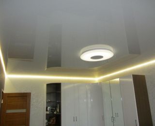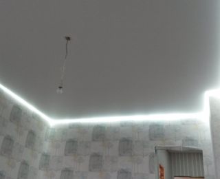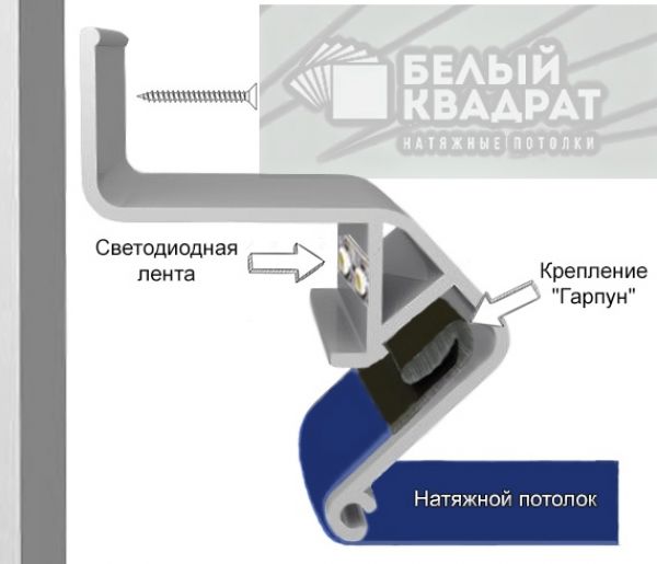 Вариант 3 - профиль обтягивается потолком. При этом ширина зазора составит около 1.5 см. Подсветка, притом клеится на профиль и светит через полотно. В случае необходимости замены светодиодной ленты придется снять всё полотно, заменить подсветку и вернуть полотно на место, как вы понимаете, это ведёт к определенным затратам.
