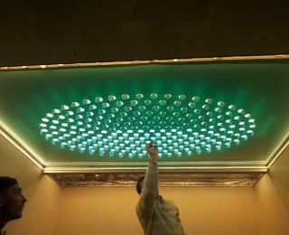 Подсветка, закрепленная на резные потолки, создает 3D-эффект в помещении, а если при монтаже использовать матовое полотно для основы и глянцевое для перфорации – светодиодная лента поможет создать эффект объема.