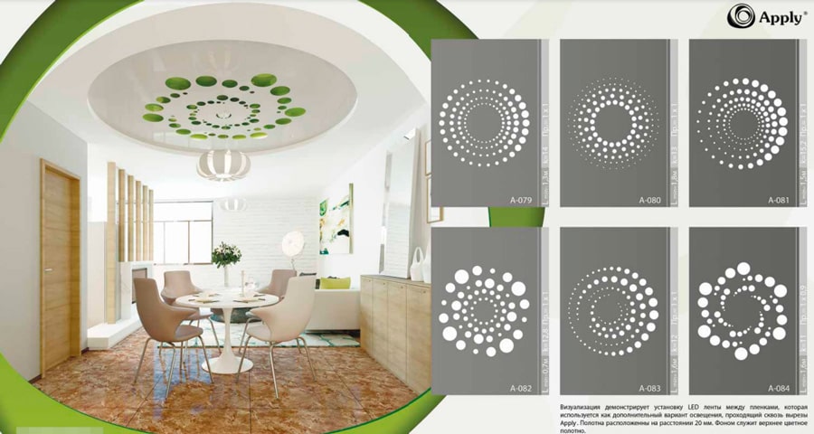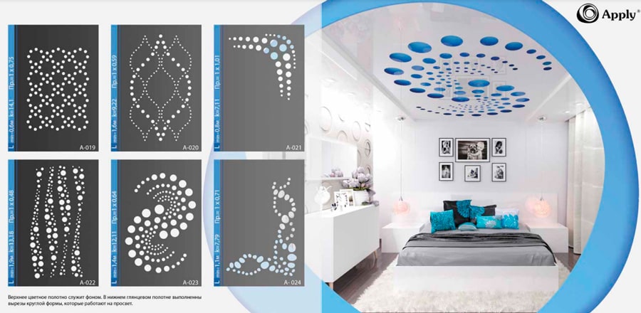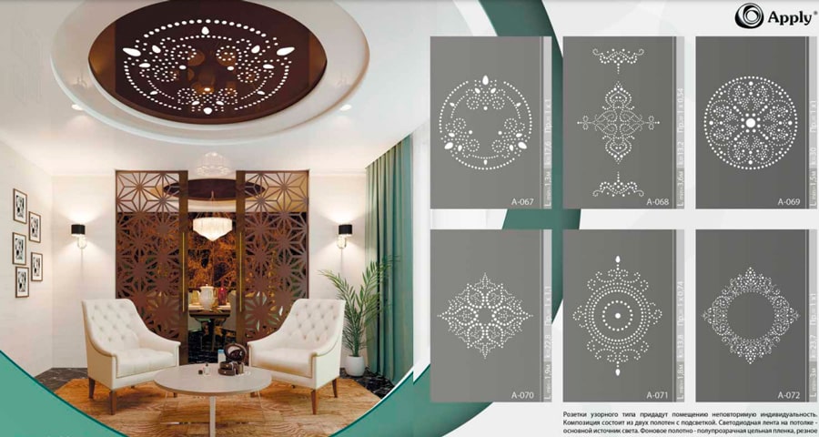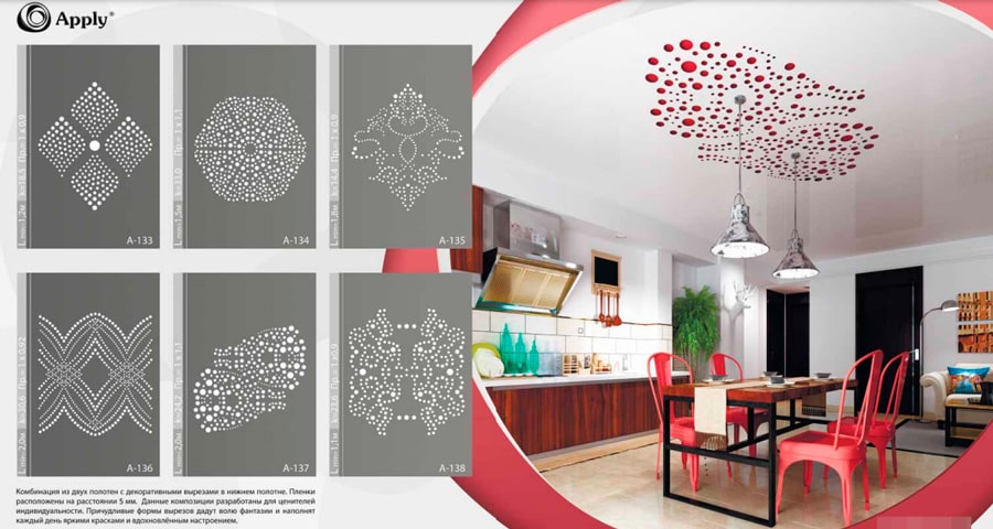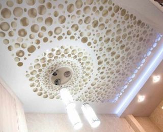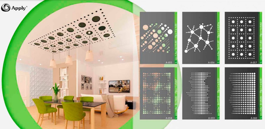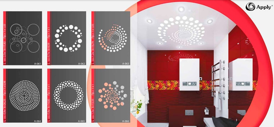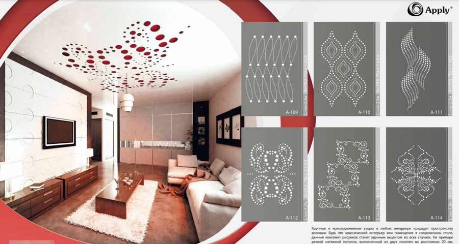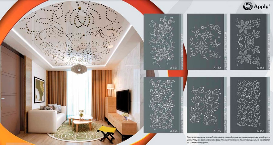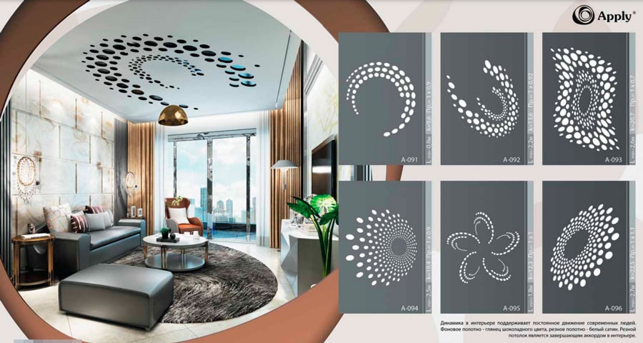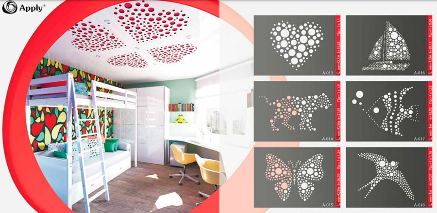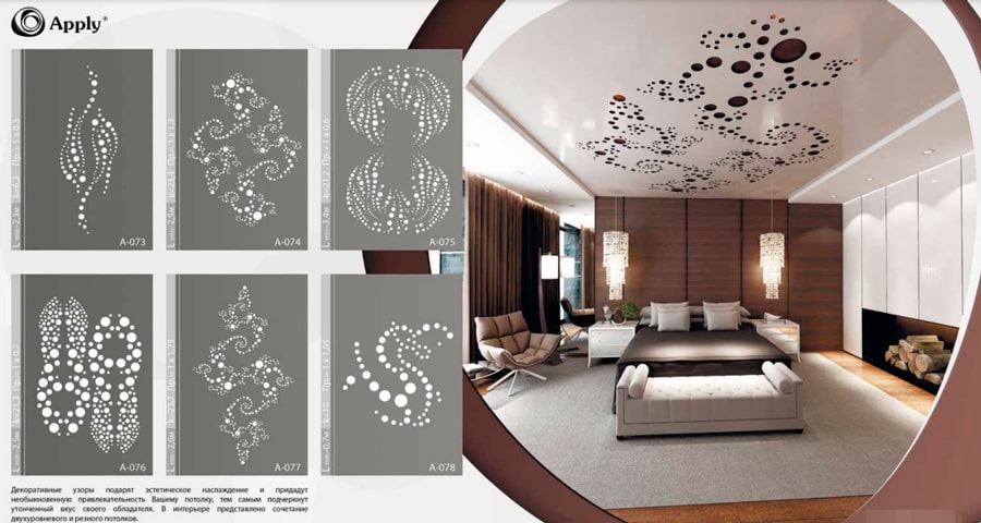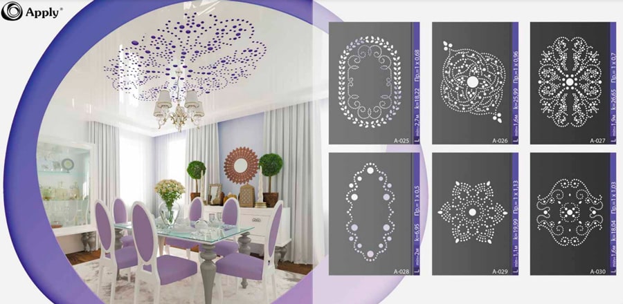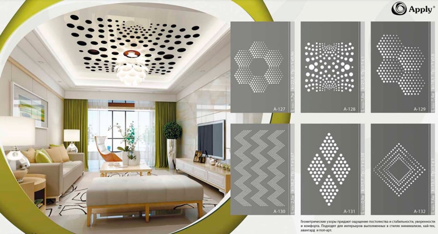Перфорированный (резной) потолок – лучший способ отразить свою индивидуальность в интерьере. Прежде чем начать монтаж, дизайнер на компьютере разрабатывает макет потолка, создает рисунок. И тут лишь ваша фантазия и творческая мысль могут иметь значения. В качестве рисунка можно применить даже фотографию.
