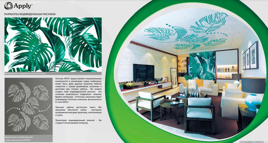 С помощью лазерного плоттера. готовы макет переносят на полотно будущего потолка. Уникальность такого метода в том, что после натяжения потолка, рисунок не расползается.