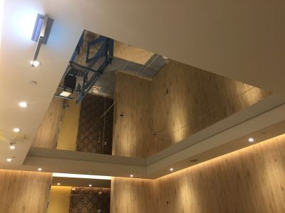 Поверхность такого полотна сравнима с классическим зеркалом по отражаемой способности и по качеству практически не различима. Ширина зеркального полотна составляет 130см, поэтому бесшовный потолок можно выполнить шириной не более 120см, а длина не ограничена. Монтируется зеркальное полотно в бесщелевой пластиковый профиль-прищепку, или в алюминиевый профиль штапиковой системы с последующей отделкой примыкания к стене декоративной заглушкой или потолочным плинтусом.